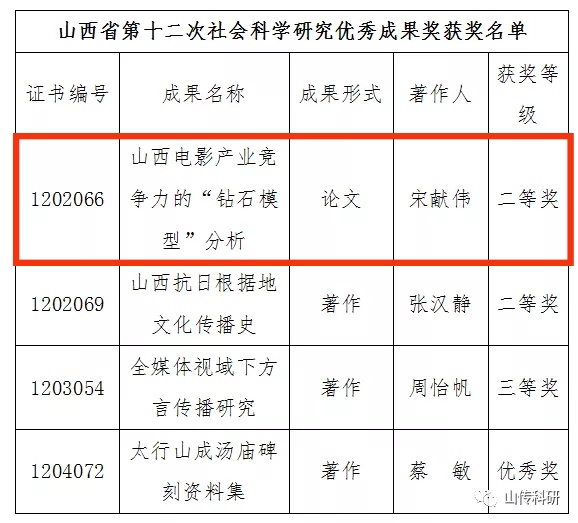 近日,山西省社会科学研究优秀成果评审委员会发布《关于表彰山西省第十二次社会科学研究优秀成果奖的决定》(晋社评[2022]3号),我校有4名教师获奖,其中我院教师宋献伟获得二等奖。