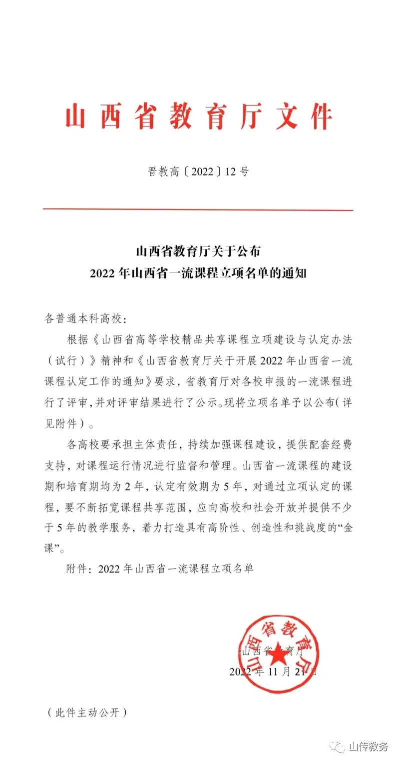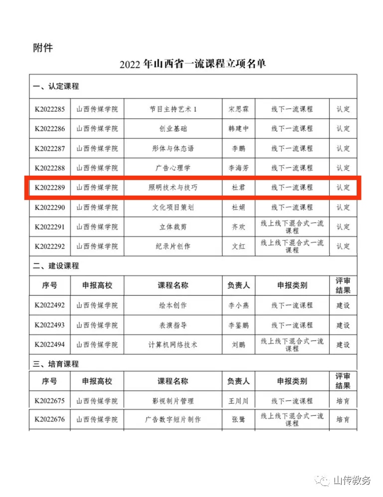 近日,山西省教育厅正式公布2022年度省级一流本科课程评审结果。我校8门课程获批认定为2022年度省级一流本科课程。其中我院教师杜君主持的《照明技术与技巧》课程,被认定为2022年度省级线下一流课程。