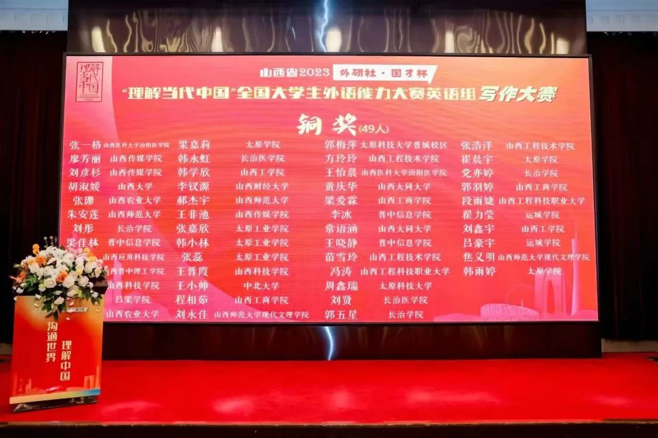 2023年11月4日,由山西省教育厅指导,山西省高等学校外语教学研究会及外语教学与研究出版社主办,山西大学承办的2023年“外研社·国才杯”“理解当代中国”全国大学生外语能力大赛省赛圆满落幕,我校学子获得多项奖项,我院22级文艺编导专业廖芳丽同学在本次比赛中荣获写作大赛铜奖。