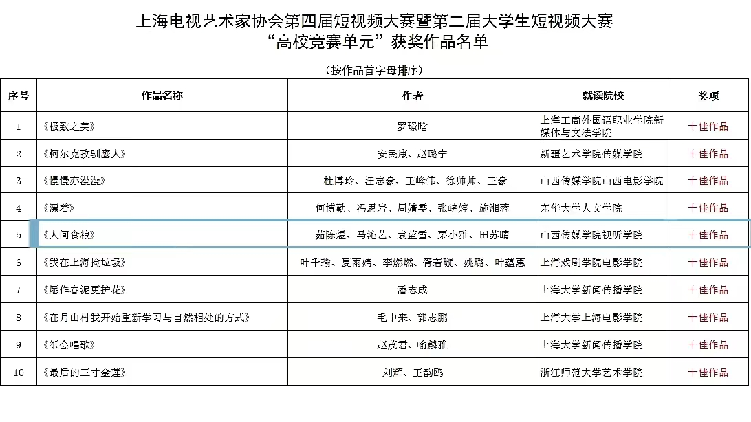 近日,“上海电视艺术家协会第四届短视频大赛暨第二届大学生短视频大赛”颁奖仪式在上海新国际博览中心成功举办。我院作品《人间食粮》荣获高校竞赛单元十佳作品。
