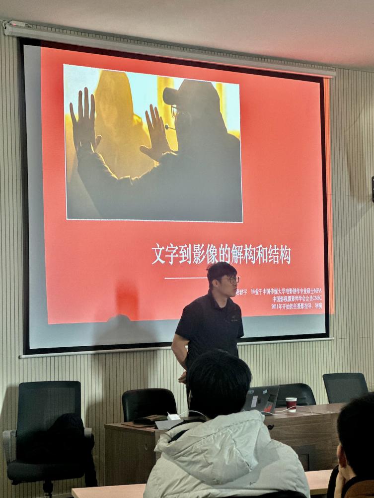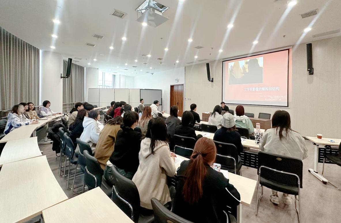 13日上午,专题讲座主要围绕文学到影像之间的转换进行。段春宇老师首先提出“什么是影像”“如何分割信息”等问题,又将文学剧本作为具体案例来向同学细致阐释如何把文字转化为画面。