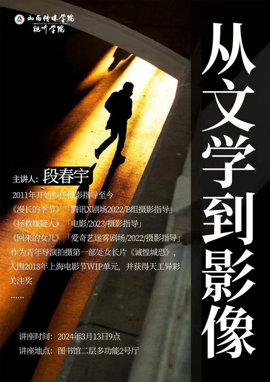 2024年3月13日,应我院邀请,电影《拯救嫌疑人》、腾讯X剧场《漫长的季节》、爱奇艺迷雾剧场《回来的女儿》等作品摄影指导段春宇莅临我校,为新闻卓越(拔尖)人才班的同学在图书馆二层多功能厅开展主题为“文字到影像的解构和结构”的专题讲座。