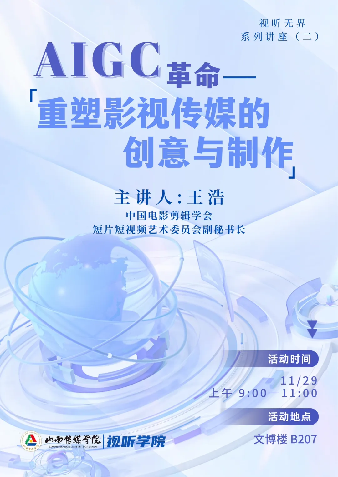 2024年11月29日,我院于文博楼成功举办题为“AIGC革命:重塑影视传媒的创意与制作”的专题讲座。本次讲座特邀中国电影剪辑学会、短片短视频艺术委员会副秘书长王浩主讲,我院广播电视编导和影视摄影与制作专业的学生及部分教师积极参与。