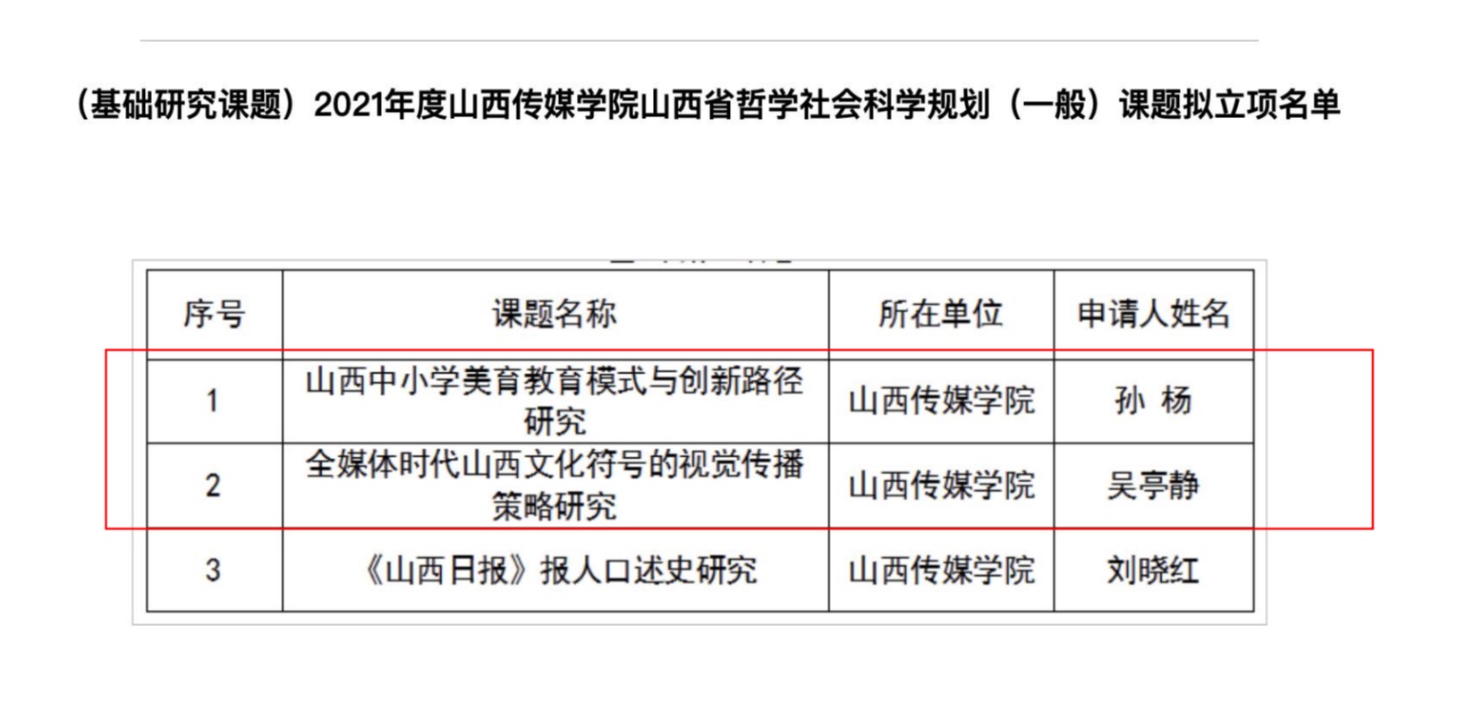 其中,我院广播电视编导专业教师孙杨的课题《山西中小学美育教育模式与创新路径研究》、吴亭静的课题《全媒体时代山西文化符号的视觉传播策略研究》均获得立项。