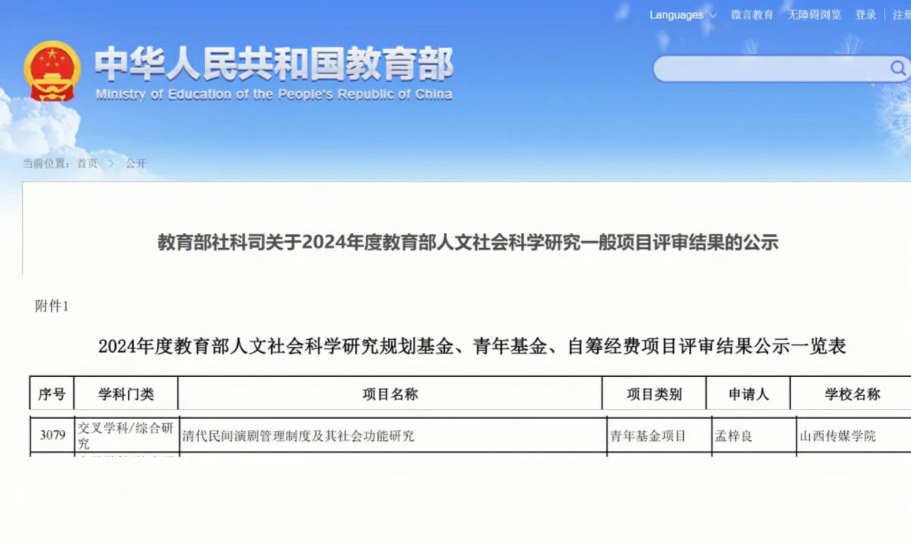 7月31日,教育部社科司对2024年度教育部人文社会科学研究一般项目评审结果进行公示,我院教师孟梓良申报的《清代民间演剧管理制度及其社会功能研究》获批青年基金项目。