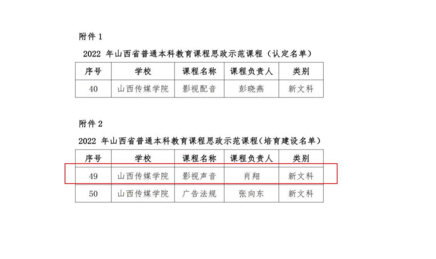 近日,山西省教育厅公布了2022年山西省普通本科教育课程思政示范课程名单,我校3门课程获批。其中,由我院录音艺术专业教师肖翔担任课程负责人的《影视声音》课程,被列入省级课程思政示范课程培育建设课程。