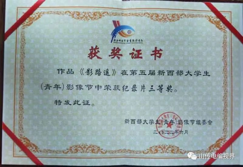 第五届新西部大学生(青年)影像节颁奖活动于近期公布结果,视听学院广播电视编导专业有两部作品获奖,分别是影路遥》(主创:崔泽娜等,指导老师:秦秀宇)《察卡洛 盐续》(主创:张凝芳、曹雪等,指导老师:秦秀宇),均荣获纪录片三等奖。